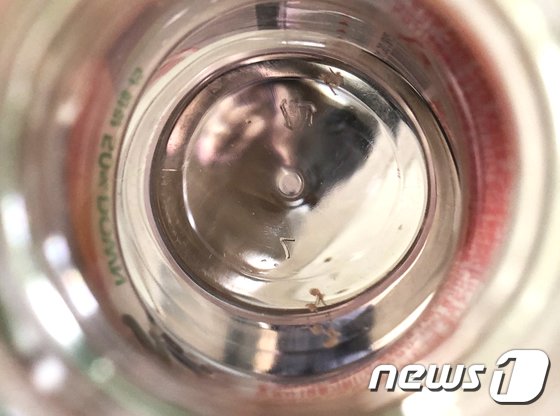 ダニの死骸はペットボトルの蓋(内側)に付着しており、このメーカーの半透明のキャップでは内側にオレンジ色の塊が透けて見える。これはダニの死骸で、メーカーは製造過程での混入を否定している。