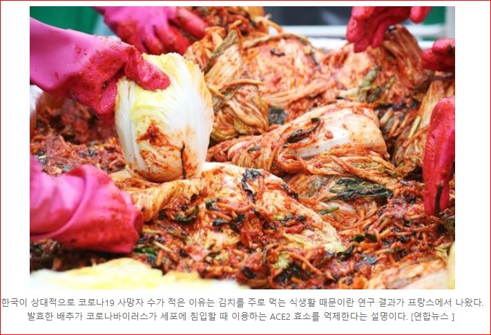 한국에서 신종 코로나바이러스 감염증(코로나19) 사망자가 상대적으로 적게 나온 이유 중 하나가 ‘김치’라는 프랑스 연구진의 분석이 나왔다.
