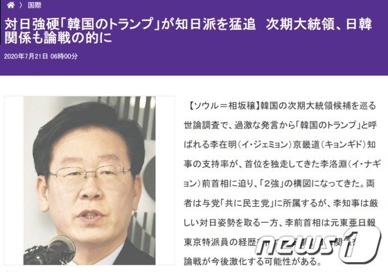 同紙は「韓国の次期大統領候補の世論調査において、過激な発言から「韓国のトランプ」と呼ばれる李在明京畿道知事の支持率が、首位を独走してきた李洛淵前総理に迫っており、「2強」構図になったと報道した。