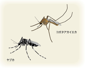 コガタアカイエカは夜間に吸血活動を行い、田畑や畜舎、水たまりなどに生息する暗褐色の小型の蚊である。