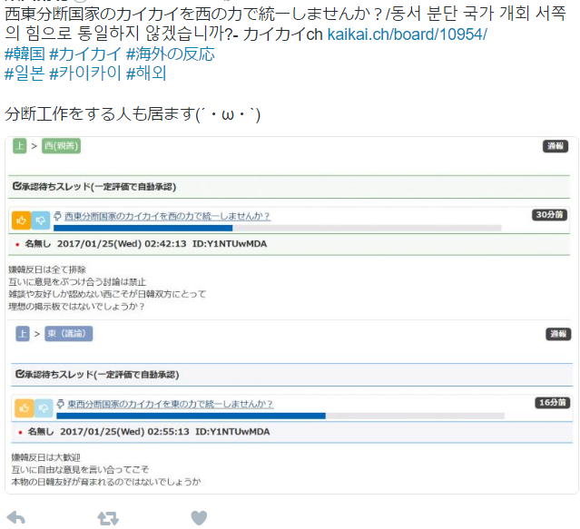 1名無し2017/01/25(Wed) 02:42:13ID:Y1NTUwMDA(1/1)NG報告嫌韓反日は全て排除互いに意見をぶつけ合う討論は禁止雑談や友好しか認めない西こそが日韓双方にとって理想の掲示板ではないでしょうか?>>2>>3>>512名無し2017/01/25(Wed) 08:21:43ID:QwMDE2MjU(1/1)NG報告>>1なんか北朝鮮みたいな「地上の楽園」だなw23名無し2017/01/25(Wed) 08:35:35ID:I3NzU2MjU(1/1)NG報告>>1ハイハイ、終了終了。94名無し2017/01/25(Wed) 08:37:43ID:I1NTA4NzU(1/1)NG報告日本人は相手によって対応を変えられるから、上っ面だけの友好を演じることは簡単だけど、そういうのがお望みなの?35東 西 南 北◆932uJsG3gE2017/01/25(Wed) 11:44:22ID:c4MjA2MjU(1/3)NG報告>>1西と東に、同じスレッドを立てた人ですね。スレッドアイコン支援w>>826名無し2017/01/25(Wed) 11:45:14ID:U0MDQ4NzU(1/2)NG報告西側には話し合いなく潰そうとする人間が多くて残念これが仲良くしようと言ってる人間のやる事かと思います37東 西 南 北◆932uJsG3gE2017/01/25(Wed) 11:48:10ID:c4MjA2MjU(2/3)NG報告晒し上げ18名無し2017/01/25(Wed) 11:48:35ID:U0MDQ4NzU(2/2)NG報告>>5惑わされましたw自分はこの人のスレに参加しないようにしたいと思いました。09東 西 南 北◆932uJsG3gE2017/01/25(Wed) 13:08:24ID:c4MjA2MjU(3/3)NG報告更に、晒し上げ。w私は、ツイッターで、全てのスレッドの紹介をしています。楽勝です。(´・ω・`)110名無し2017/01/27(Fri) 00:38:23ID:YxNjMxMDE(1/1)NG報告偉大にして崇高なる主席管理人の指導の元、下劣なる東陣営に慈悲なき鉄槌を与えることになるだろう411名無し2017/01/27(Fri) 01:05:10ID:Y3MzYyMjA(1/1)NG報告なに言ってだバカ012名無し2022/05/30(Mon) 03:27:59ID:E2MDczNDA(1/1)NG報告西の力で日韓友好!>>13113名無し2022/06/28(Tue) 17:48:49ID:cxNDM1MjA(1/1)NG報告>>12荒らしだあ014名無し2023/03/06(Mon) 21:46:02ID:A3NzI4MjA(1/1)NG報告荒らされも、議論するなら、東、のんびり,表現するなら、西、この区分は、必要0