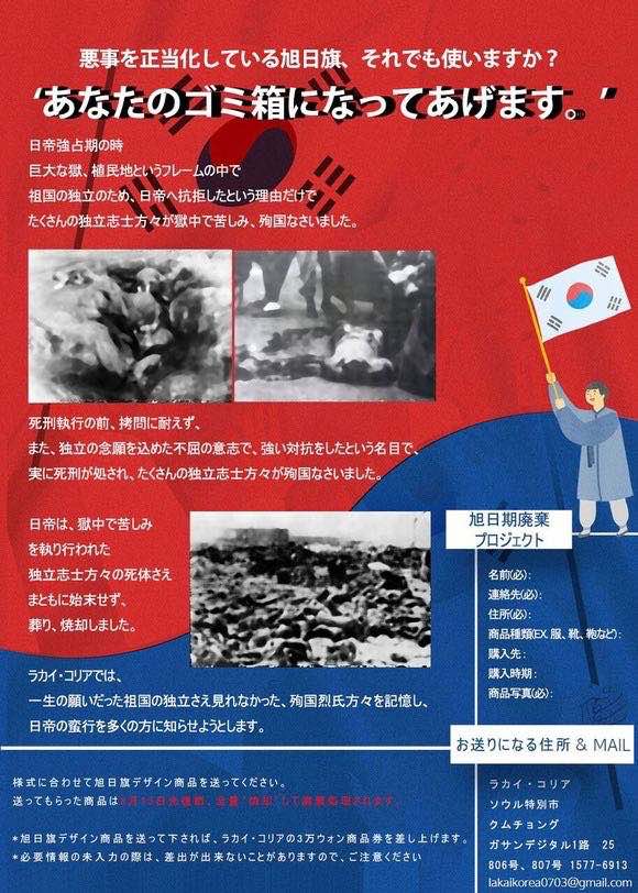 靴企業ラカイコリア、旭日旗製品を回収して8月15日に燃やして捨てるプロジェクトを推進中…「あなたのゴミ箱になります」