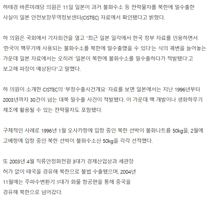 韓国国会で2015年から19年3月までに、摘発されただけで156件の不正輸出が韓国政府の資料によって判明している。行き先不明のフッ化水素の量も確定している。