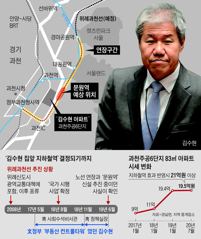キム・スヒョン前(前)大統領府政策室長が、大統領府に勤める当時、政府と果川市が金前室長所有のアパートの前を通る電車路線を新設し、わずかのすぐ前に電車の歴史(驛舍)を建設することに決定した事実が最近知られ議論が起きている。金前室長は、当時の政府の広域交通対策の報告を受け調整・決定する位置にあった。彼のアパートは、最近3年間の間に10億ウォン上がったが、いわゆる「駅周辺効果」で「最小2億ウォンはさらに上がるだろう」と不動産業界では、予測する。