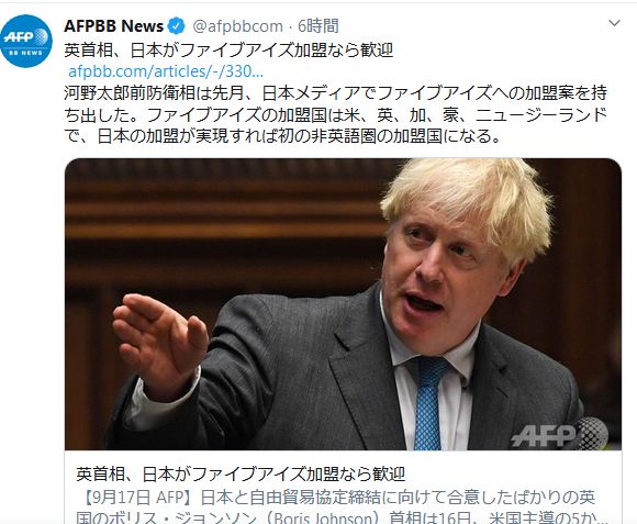 【9月17日 AFP】日本と自由貿易協定締結に向けて合意したばかりの英国のボリス・ジョンソン(Boris Johnson)首相は16日、米国主導の5か国の情報機関による多国間協定「ファイブアイズ(Five Eyes)」に日本が加盟する可能性について語り、そうなれば歓迎すると述べた。