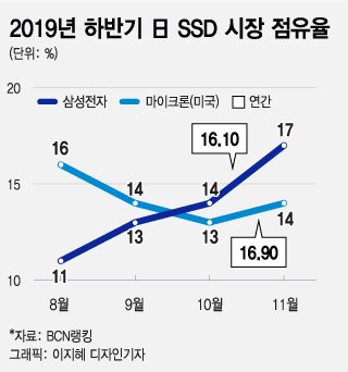 삼성전자가 일본 내 SSD(솔리드스테이트드라이브, 반도체를 이용한 정보 저장장치) 시장에서 '1위'에 오를 전망이다. 대용량과 압도적 성능을 앞세운 삼성전자는 기존 마이크론과 WD(웨스턴디지털) 양강 체제를 무너뜨리고 이 시장 1위에 오를 전망이다. 특히 일본에선 올 하반기 콘솔 게임 신제품이 7년 만에 출시되는 만큼 SSD 수요가 크게 늘어날 전망이다.