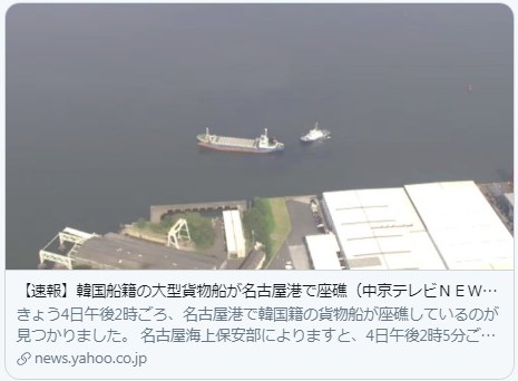 【速報】韓国船籍の大型貨物船が名古屋港で座礁