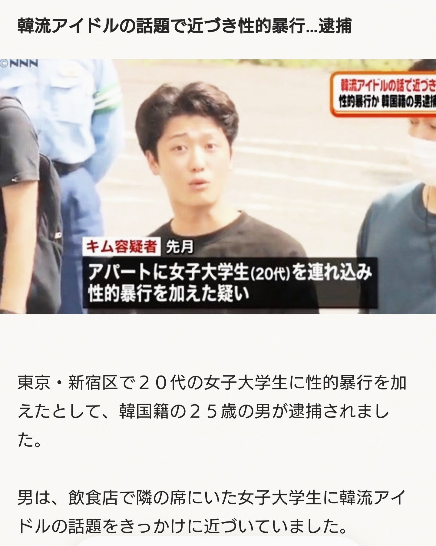 もっともコロナで当分、顔を見ることもないだろうがw韓国男ってAVの見すぎなんじゃないの。新大久保だけじやなく韓国男の性犯罪は日本各地で起こってるみたいだし。何故か韓国男は日本女性に人気があるって勘違いしてるし。自分の妹や女友達が韓国男のナンパを無視したり断ったら怒鳴られたし。どうせ、今回の新大久保の性犯罪事件も韓国国内ではチョッパリのでっち上げ事件だとか言ってるんじゃないの?韓国男は性犯罪しても合意の上になると思ってんの?性犯罪の時に怖くて声が出せない、気の弱い女性もいるのに。性犯罪の被害者の中には自殺したり気がおかしくなる人も沢山いるんだよ。確実に若い世代にも嫌韓は広がっている。