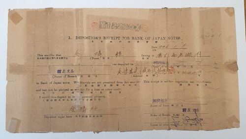 現金保管証には、1946年3月5日、趙興銀行豊川支店のパク・ジョンソン支店長が、礼川郡保文面ミホドンに住むキム・ジュシク氏の日本のお金1万2220円を受けて保管することを証明すると書かれている。キム氏のサインとチョ・フン銀行の職人が写っており、他の人が所有権を侵害できないとも明示されている。