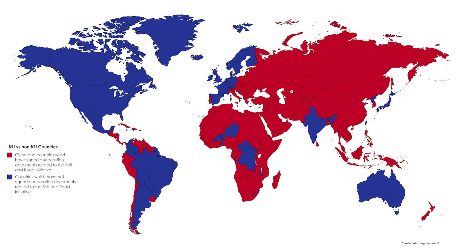 イギリス人が第三次世界大戦の対戦国をレッド(中国の一帯一路イニシアチブに署名した国)とブルー(していない国)に分けて図にした