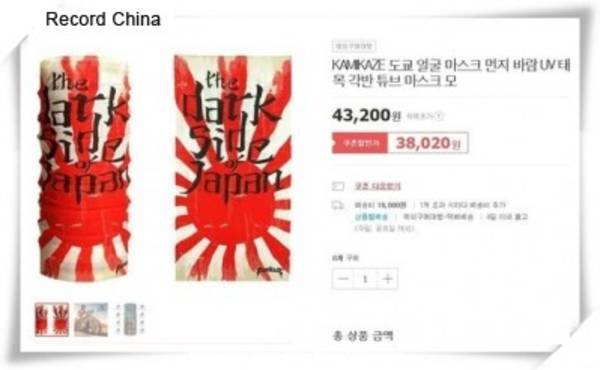 記事によると、韓国・誠信(ソンシン)女子大の徐?徳(ソ・ギョンドク)教授は、光復(植民地からの解放)75周年を記念して、韓国内の代表的なオンラインストア24カ所を調査した。その結果、18カ所で神風特別攻撃隊デザインのTシャツ、帽子、靴などの商品が販売されていた。