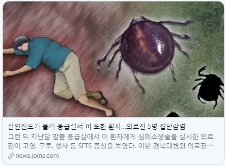 病院関係者は「心肺蘇生法の過程で、患者が血を吐き、これが医療スタッフにはねた」とし「この過程でSFTSに感染してしまったと推定される」と述べた。この患者は、心肺蘇生術に呼吸が一時戻ってきたが、4日後に死亡した。その後、先月末頃緊急治療室では、患者に心肺蘇生法を実施した医療スタッフが高熱、嘔吐、下痢などのSFTS症状を見せた。(後略)