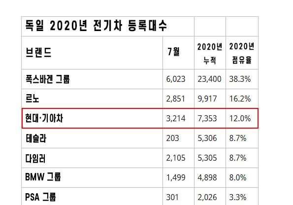 12일 독일연방자동차청(KBA·Kraftfahrt-Bundesamt) 등에 따르면 현대·기아차는 2020년 7월 말 현재 독일에서 전기차 7353대를 판매, 테슬라를 제치고 3위에 올랐다. 점유율은 12.1%에 달한다.