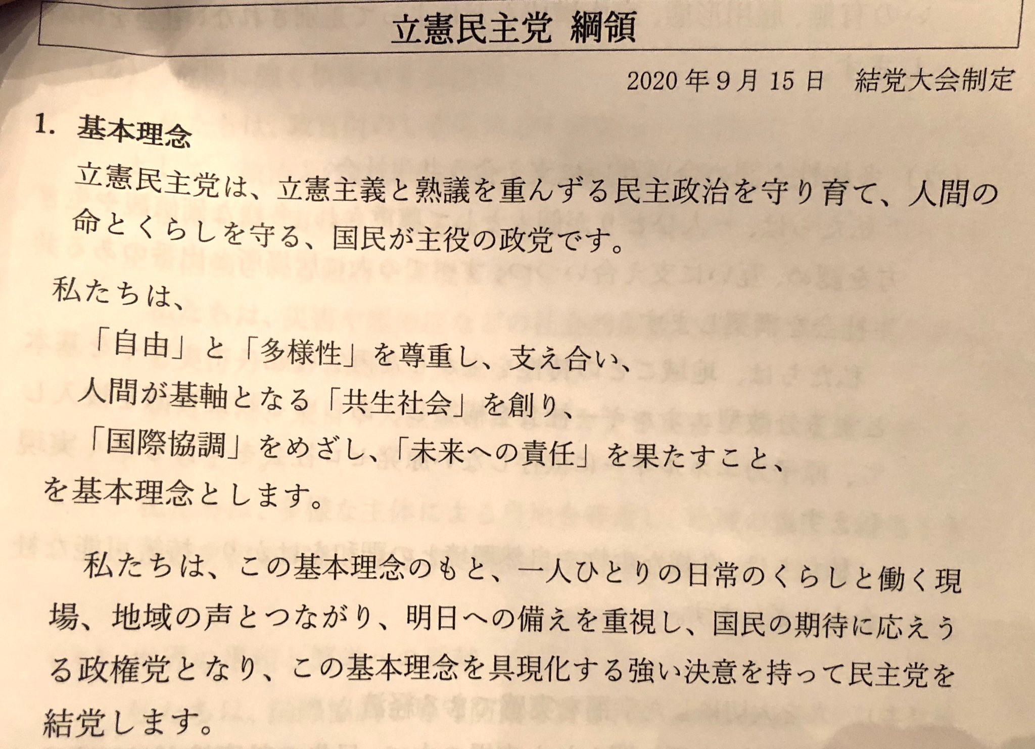 立憲民主党の結党大会で報道陣に配られた党の綱領・規約承認書です。