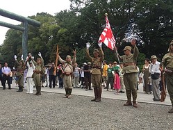 15日に靖国神社前で右翼団体会員らが旧日本軍の制服を来て万歳三唱をしている