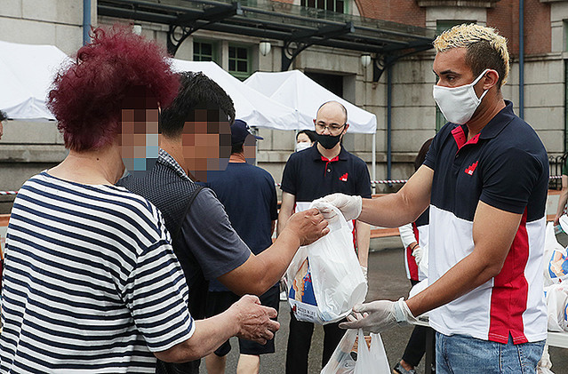 長い行列の先頭では、一人のブラジル人がホームレスの人々にビニール袋を配っていた。