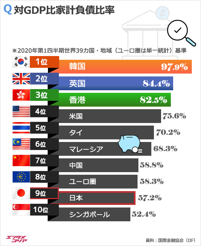 20日、国際金融協会(IIF)の報告書「世界負債モニター」によれば、今年第1四半期の韓国の国内総生産(GDP)比家計負債比率は97.9%で、調査対象39カ国中で最も高かった。次いで英国(84.4%)、香港(82.5%)、米国(75.6%)、タイ(70.2%)、マレーシア(68.3%)、中国(58.8%)、ユーロ地域(58.3%)、日本(57.2%)の順だった。韓国の家計負債比率は、昨年第1四半期(92.1%)より5.8%高まり、香港(9%)、中国(6.4%)に次いで上昇幅が大きかった。