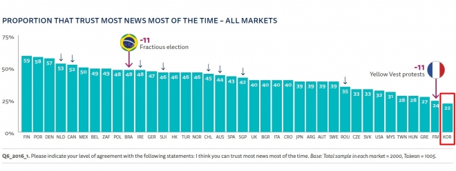 韓国のマスコミ信頼性は2016年23%、2017年23%、2018年25%、2019年22%で、調査対象国の中で、すべて最下位だった。「韓国メディアの信頼性、4年連続で不動の最下位」という不名誉の実体である。