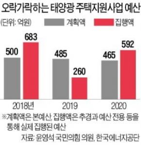 ユンヨウンソク国民の力議員が19日、韓国のエネルギー公団から提出された「住宅支援事業予算と支援の現状」によると、昨年、太陽光住宅支援事業に予算485億ウォンが編成された。しかし、このうち260億ウォンだけ執行され、残りの金額(約225億円)は、建物用燃料電池の補助金に使途が変更された。2019年1月に発表されたドア大統領の「水素経済ロードマップ」に基づいて、太陽光補助金の予算を燃料電池の予算に変え使用である。