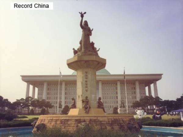 25日、韓国・世界日報によると、与党「共に民主党」の金弘傑議員が、旭日旗など日本帝国主義の象徴物を使用する行為を処罰する内容の刑法改正案を代表発議した。写真は韓国国会。(Record China)