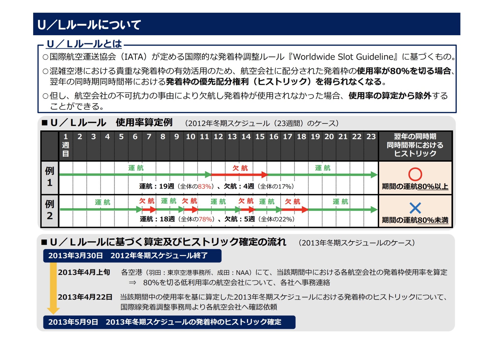 U/Lルールとは、国際航空運送協会(IATA)が定める発着調整のガイドラインで、混雑空港で割り当てられた発着枠の少なくとも80%を使用しない場合、翌年に発着枠の割当優先権を失い、希望する発着枠を獲得できない可能性があるというもの。 航空会社は低い搭乗率のまま運航を継続するか、発着枠を獲得できないリスクを負うことになる。 https://www.mlit.go.jp/common/000988790.pdf>>1