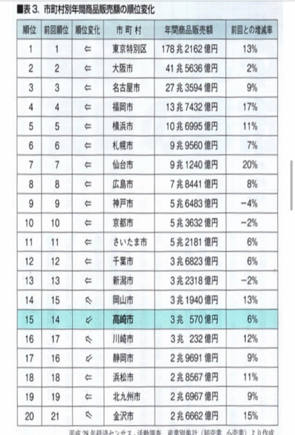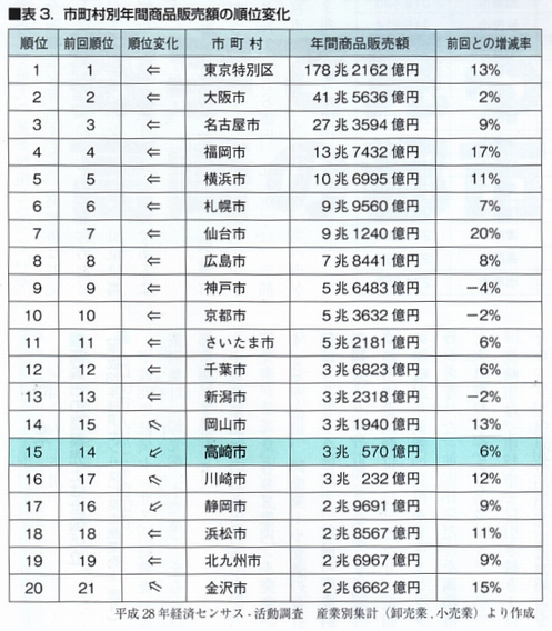 高崎は卸売の比率がかなり高く、ランキングの他の都市よりも小売り店は相当に貧弱