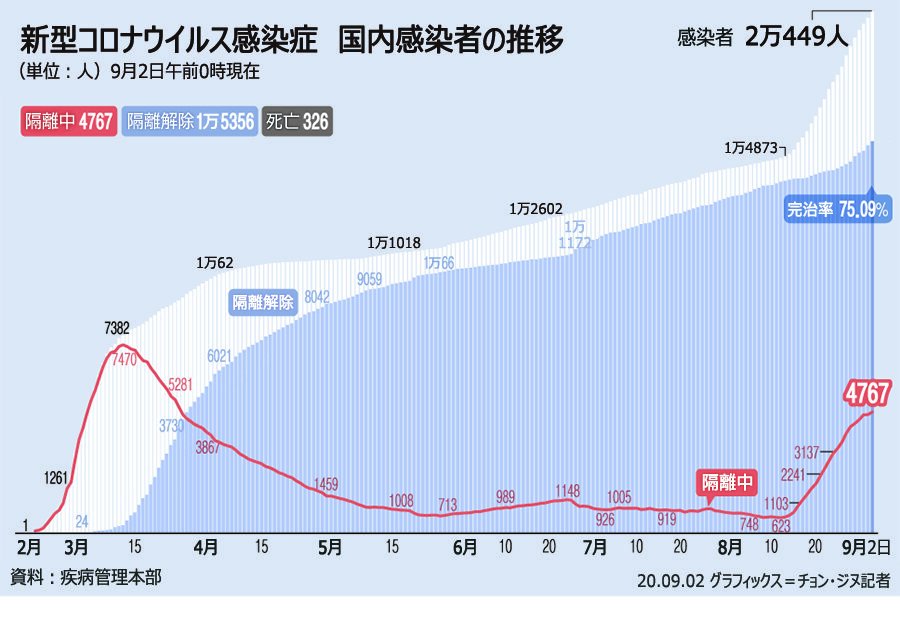 韓国疾病管理本部中央防疫対策本部は2日、新型コロナウイルス感染者が1日0時から24時までの間に新たに267人(2日0時現在)確認され、韓国国内の累計感染者数は2万449人と発表した。完治した累計患者数は前日より158人増えて1万5356人、累計死者数は前日より2人増えて326人。