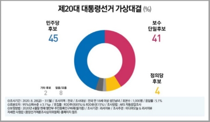 世論調査専門機関のリサーチビューが先月28日から4日間、アンケート調査を実施した結果、民主党候補の支持率は45%で、保守陣営の単一候補(41%)を4ポイントリードした。知ってた(^^)