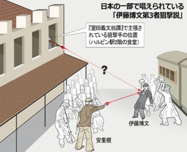 実際に伊藤の体から摘出されたのはフランス騎馬隊が使用するカービン銃の弾で、安の7連式ブローニング拳銃の弾とは異なります。また伊藤の傷は右肩から斜め下にむけたもので、高い場所から狙われたことを示していました。