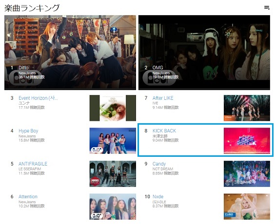 2022年は KPOP曲の30位以内ランク入り無し。日本のランキング上位には、KPOP曲は入ってきませんが、韓国の youtube 再生回数ランキングに「チェンソーマン」OP曲の「KICK BACK」が入ってしまいましたね。