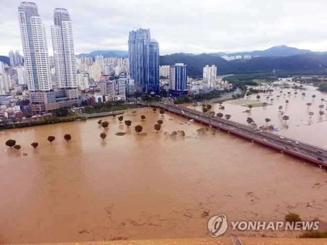 (蔚山=聯合ニュース)7日、第10号台風「ハイライン」の影響で降った大雨蔚山太和江が氾濫して周辺道路が水に浸っている。