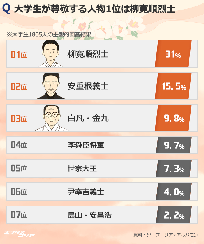 そのほか尹奉吉(ユン・ボンギル)=4.0%=、安昌浩(アン・チャンホ)=2.2%=、尹東柱(ユン・ドンジュ)=1.4%=、蔣英実(チャン・ヨンシル=1.3%=、丁若鏞(チョン・ヤギョン)=0.8%=が10位以内にランクインした。