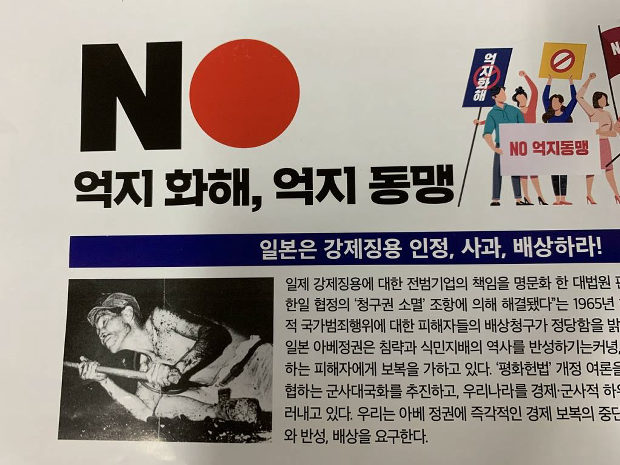 問題のチラシは「民族の自主と平和のための第12期韓国労総統一先鋒隊」という左派組織が作成。日本製品不買を呼びかける「NO」のロゴとともに、日本に対して、いわゆる徴用工を「認定、謝罪、賠償をせよ!」と求めるハングルと炭鉱労働者の写真が掲載されている。