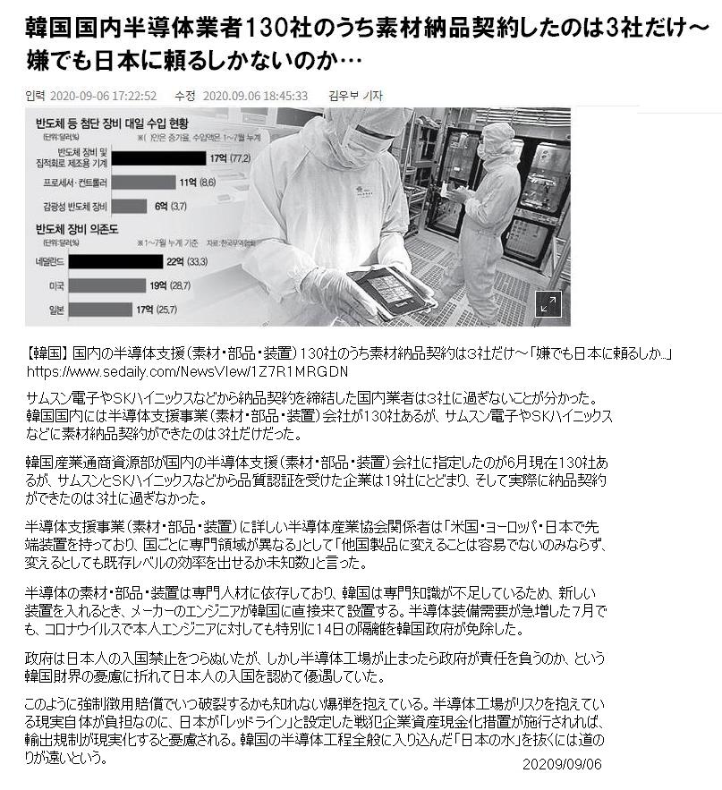 ソウル経済「NO JAPANでも日本に頼るしか」 国内半導体業者130社のうち・・