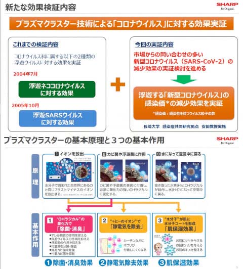シャープは、長崎大学感染症共同研究拠点 安田二朗教授(兼 熱帯医学研究所教授)、同研究拠点 南保明日香教授(日本ウイルス学会理事)、および島根大学医学部 吉山裕規教授(日本ウイルス学会理事)と共同でプラズマクラスター技術搭載ウイルス試験装置を作成し、感染症研究の世界的権威である長崎大学の協力の下、空気中に浮遊する「新型コロナウイルス」にプラズマクラスターイオンを約30秒照射することにより、感染価が90%以上減少することを世界で初めて実証しました。
