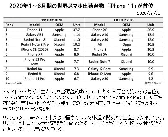 【韓国経済】 2020年1~6月期の世界スマホ出荷台数 「iPhone 11」が首位 サムスン負ける 2020/09/02