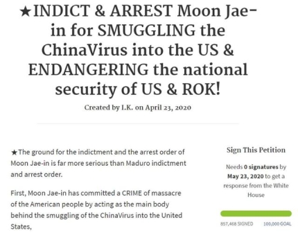 2020年10月6日、韓国・世界日報によると、今年4月、米ホワイトハウスの請願ウェブサイトに文在寅(ムン・ジェイン)大統領の逮捕を求める請願が書き込まれたが、これに署名した人が100万人を超えた。署名の多さは請願案件中、圧倒的な1位、過去に100万人を超えた例はごく少数だといい、「異例の出来事」だと評されているという。