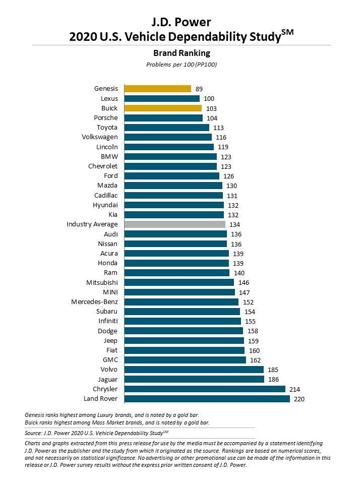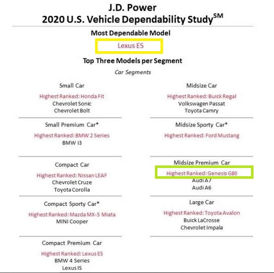 현대 제네시스, 2020년 JD 파워 내구성 평가 1위