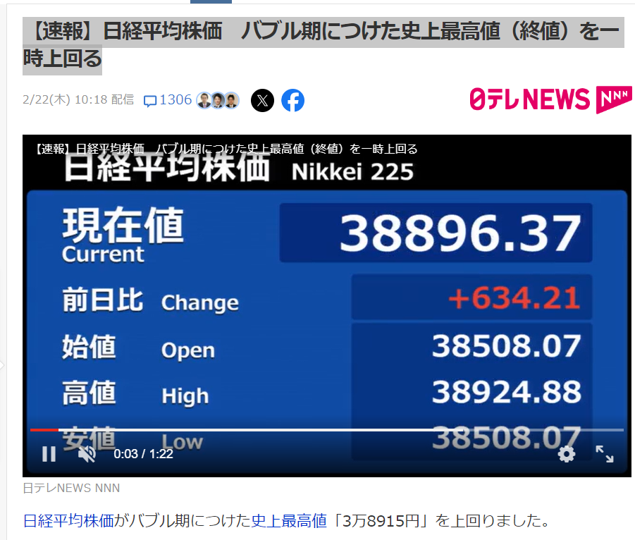 これだけ実体経済で痛めつけられてもまだおかしいと気付けないあたり、やはり先天的に学習機能が欠如しているのだろうか....?日本証券市場、「失われた30年」を越えた。取引中、史上最高値を更新