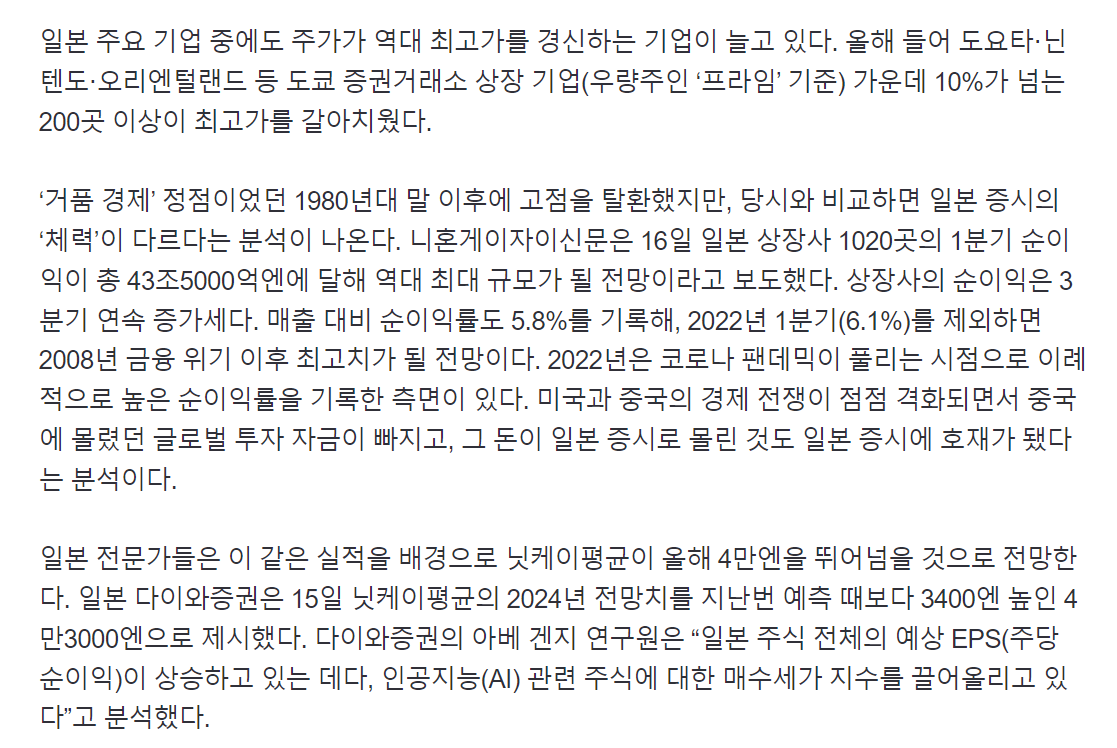 日本の専門家らは、このような実績を背景に、日経平均が今年4万円を上回るものと予想している。 日本の大和証券は15日、日経平均の2024年の展望値を前回の予測より3400円高い4万3000円と提示した。 大和証券の阿部健二研究員は「日本株式全体の予想EPS(1株当り純利益)が上昇しているうえに、人工知能(AI)関連株式に対する買収勢が指数を引き上げている」と分析した。- 141