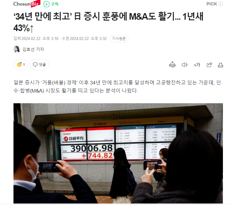 日本の証券市場が「バブル(バブル)経済」以後34年ぶりに最高値を達成し高空行進している中で、買収·合併(M&A)市場も活気を帯びているという分析が出てきた。