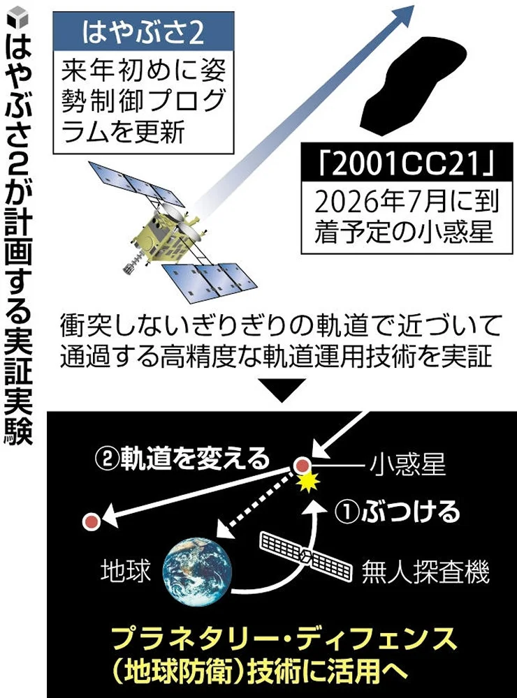 宇宙航空研究開発機構( JAXAジャクサ )が、小惑星探査機「はやぶさ2」を使い、地球に衝突しそうな小天体に探査機をぶつけて軌道を変える「プラネタリー・ディフェンス(地球防衛)」技術の獲得に向け、準備を本格化させる。高精度な飛行ができるよう、来年初めに姿勢制御装置のプログラムを更新。2026年に到着する小惑星で、衝突ぎりぎりまで接近する軌道運用技術の実証実験を行う。