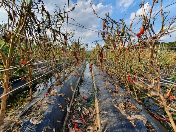 今月4日、忠清北道槐山郡清川面(クェサングン・チョンチョンミョン)の唐辛子畑で会ったユン・ミョンオクさん(73)は、”借金の心配”にため息をついた。4000平方メートル(約1200坪)で、昨年は唐辛子を4000斤(1斤=600グラム)を収穫したというユンさんは「今年は160斤しか収穫できなかった」と言いながら、黄色くなった唐辛子のぶら下がった茎を切っていた。「炭そ病に軟腐病まで重なって、使えるものが一つもない。50日以上も雨が降ったから、農業がうまくいくわけがない。周り農家のほとんどが同じ状況。本当に胸が痛みます」