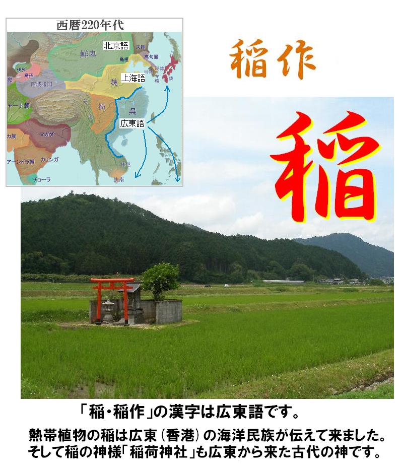 「稲作」の漢字は広東語です。このように漢字でも稲作が何処から来たのか分かります。