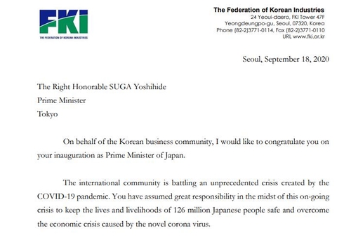 韓国経済団体の全国経済人連合会(全経連)は20日、許昌秀(ホ・チャンス)会長が菅義偉新首相に就任を祝う書簡を送り、両国関係の発展に期待を表明したと発表した。