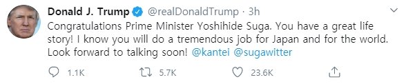 トランプ大統領はこの日、ツイッターに「おめでとう、菅義偉総理大臣。あなたの歩んできた人生はすばらしい」と投稿した。