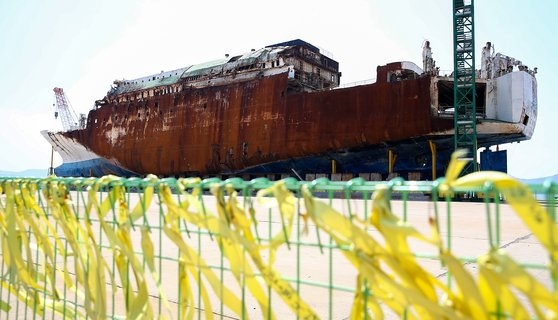 「真相究明必ずよ」セウォル号遺族、事故海域・船体の前誓い