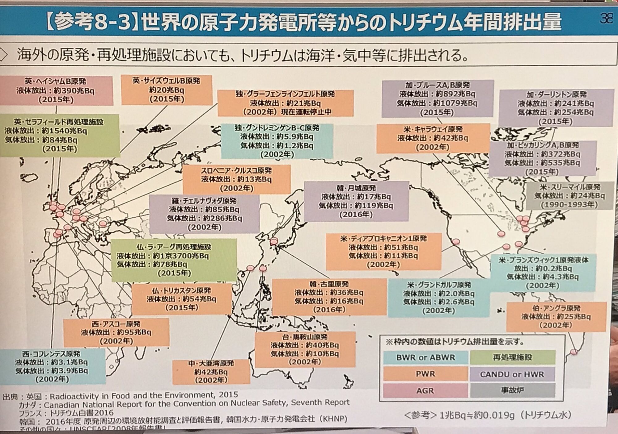 >>月城原子力発電所からのトリチウム年間放出は、トリチウム回収設備の導入や一部原子炉の停止などで2010年以降半減しているが、2009年までは400テラベクレルを超えていた。4基体制に入った1999年10月以降だけで見ても、これまでに累積で6,000テラベクレルを超えるトリチウムを放出してきた。