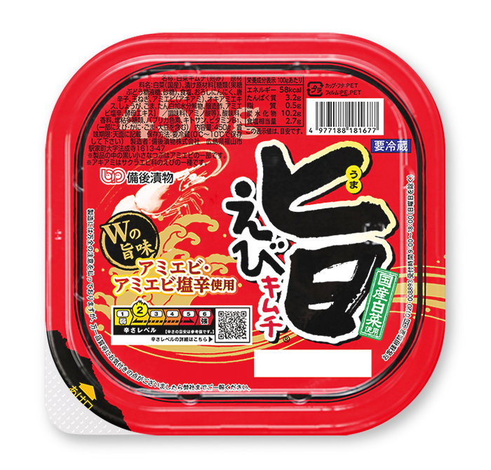 白菜(国産)、漬け原材料【糖類(果糖ぶどう糖液糖、砂糖)、食塩、おろしにんにく、唐辛子、玉ねぎ、アミエビ(アキアミ)、オキアミエキス、しょうが、ごま、たん白加水分解物、醸造酢、アミエビ塩辛、酵母エキス】 /調味料(アミノ酸等)、酸味料、香料、増粘多糖類、パプリカ色素、キトサン、ビタミンB1、(一部にえび・かに・ごま・大豆を含む)>>108