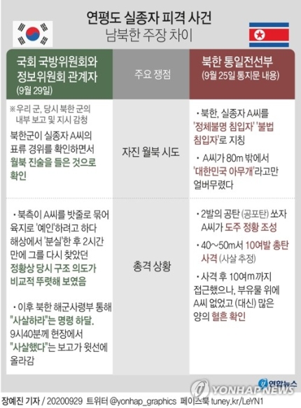 国防委関係者は聯合ニュースとの通話で「傍受を通じて北朝鮮軍の射殺命令と命令履行事実をリアルタイムで確認したら、これを大統領に直ちに知らせるべきだった」とし「夜明けに関係長官会議まで召集した青瓦台国家安保室はコントロールタワー機能を全くしなかった」と主張した。>>395